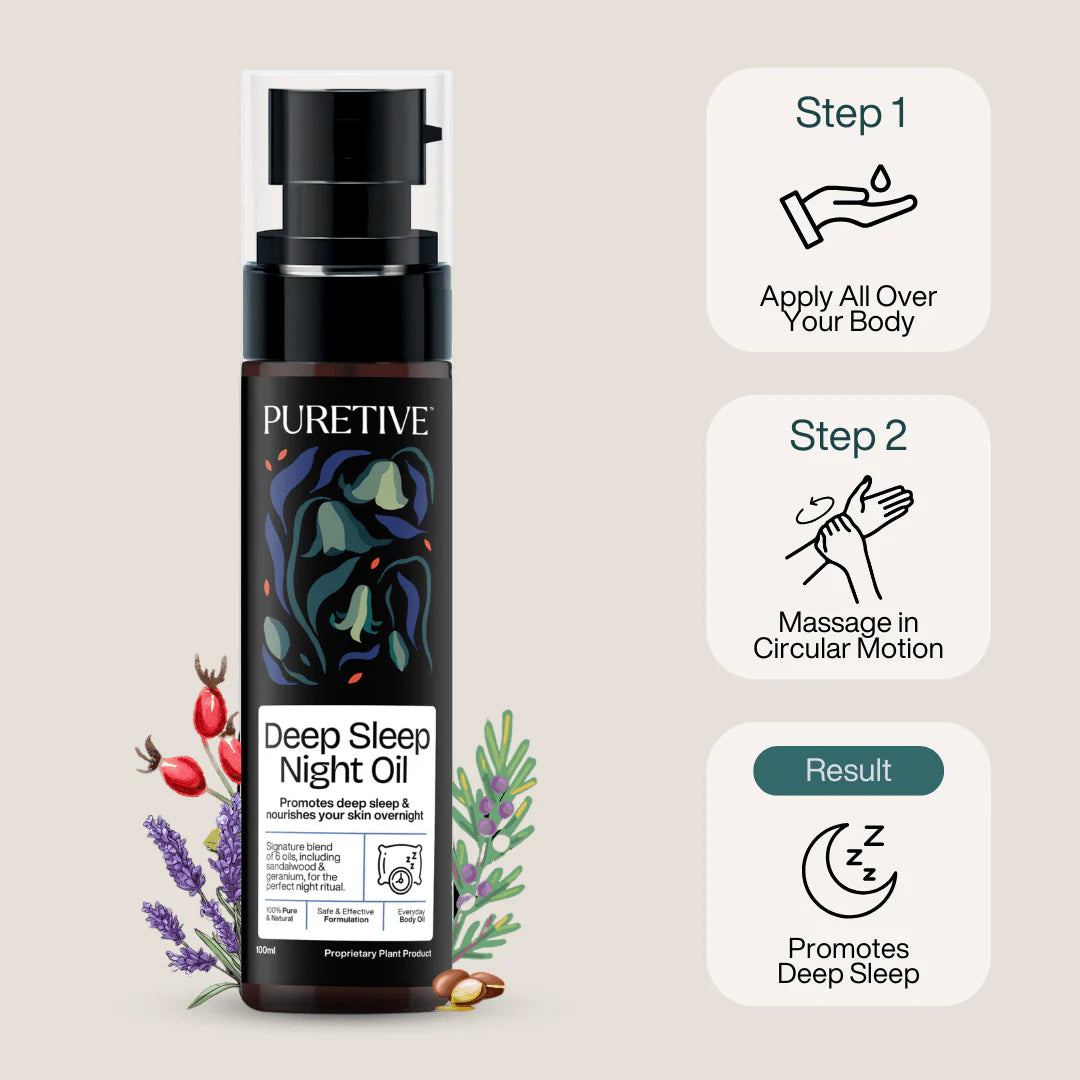 PURETIVE Deep Sleep Night Oil is enriched with skin-loving oils and therapeutic essential oils to relax the mind & nourish the skin overnight: