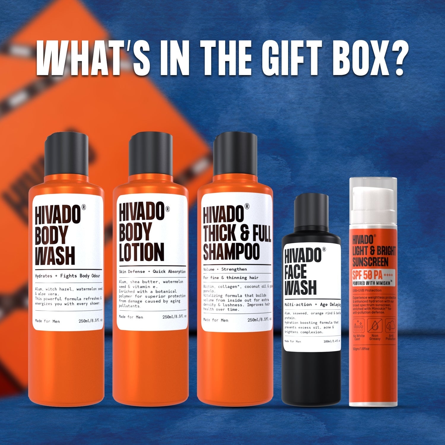 Hivado presents a remarkable gift box for men. Whether it's a special occasion or a token of appreciation, this premium collection is a versatile and thoughtful present for every man in your life. It's care for Face, hair and body: formulations that cleanse and nourish from head to toe.This box includes: Body Wash 250 ml Body Lotion 250 ml Face Wash 100 ml Light & Bright Sunscreen 50 gms Thick & full shampoo / Daily detox shampoo 250 ml