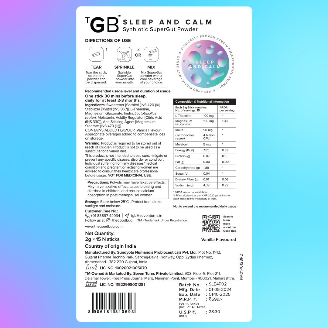 Meet Sleep & Calm: A pioneering sleep solution, thoughtfully crafted with the serene powers of L. reuteri, Melatonin to enhance your sleep patterns, L-theanine for mental clarity and calm, and magnesium for deep relaxation. This exceptional formula is your key to unlocking restorative sleep. Experience the profound connection between gut health and peaceful slumber, as our innovative blend nurtures your digestive health and paves the way to tranquility.