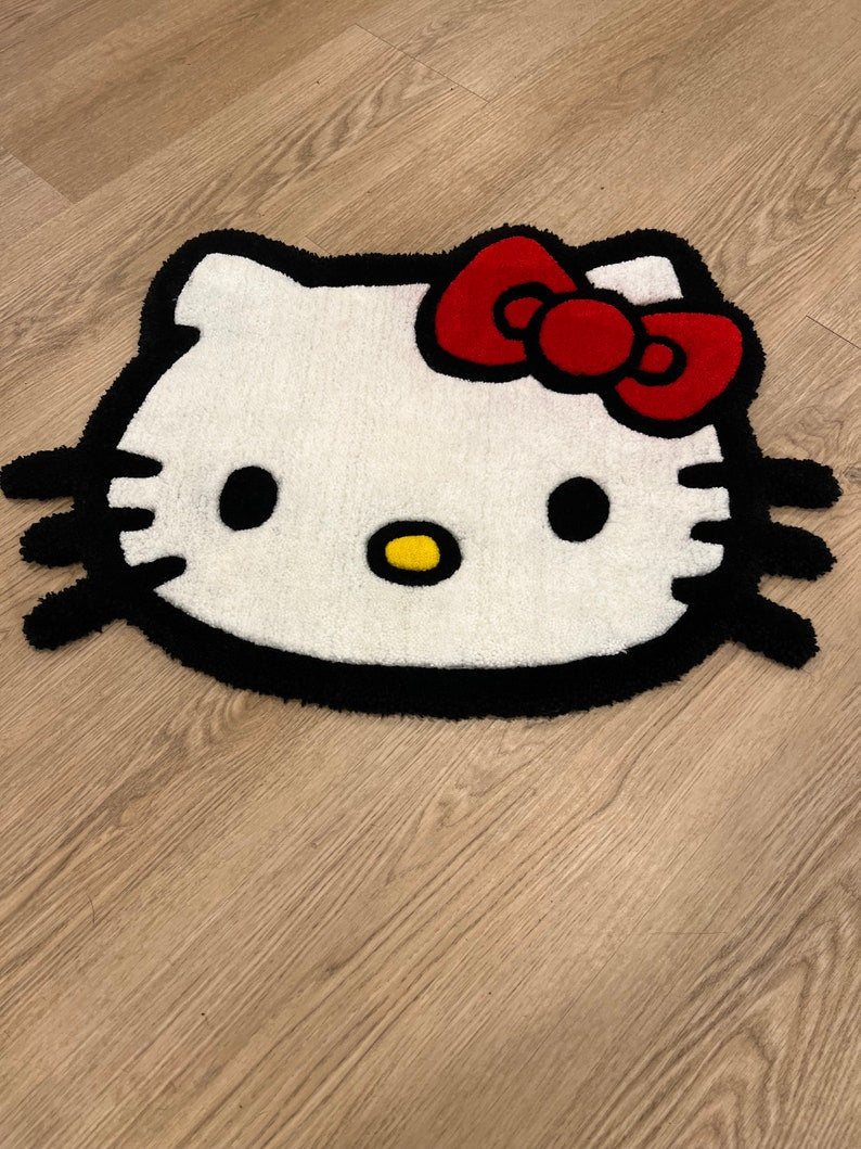 A cute, hand-tufted Hello Kitty face rug with non-slip backing, perfect for kids’ rooms or dorms.
