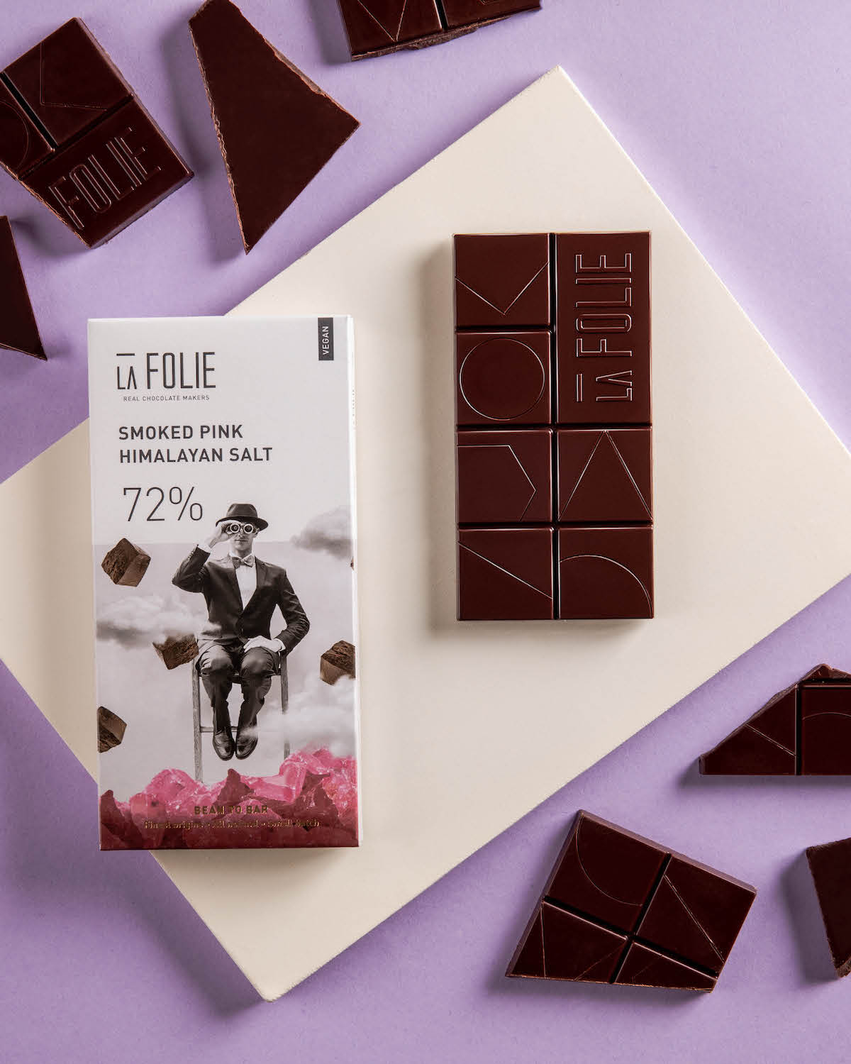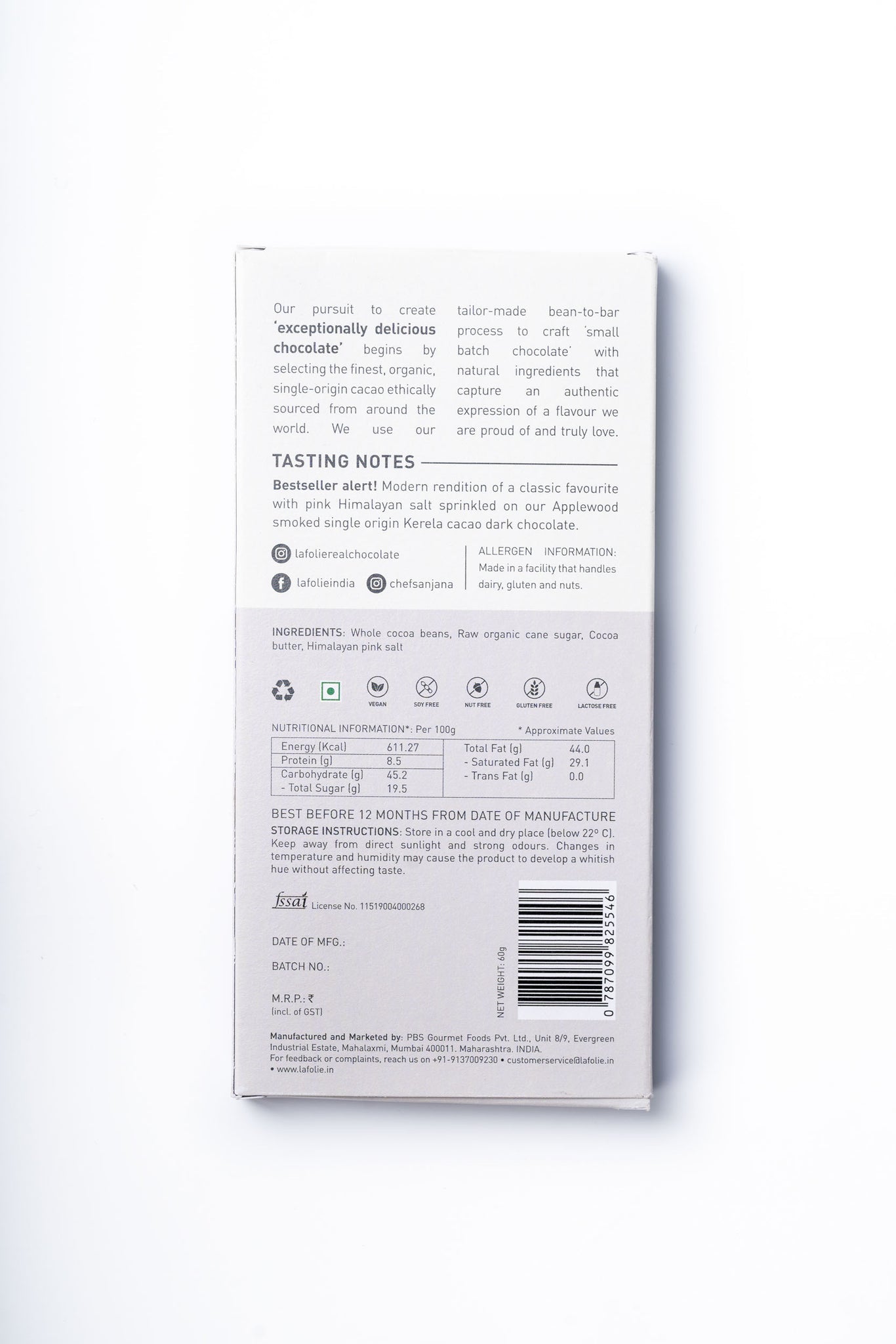 Modern rendition of a classic favourite with Applewood -smoked pink Himalayan salt sprinkled on our single dark chocolate blend.
