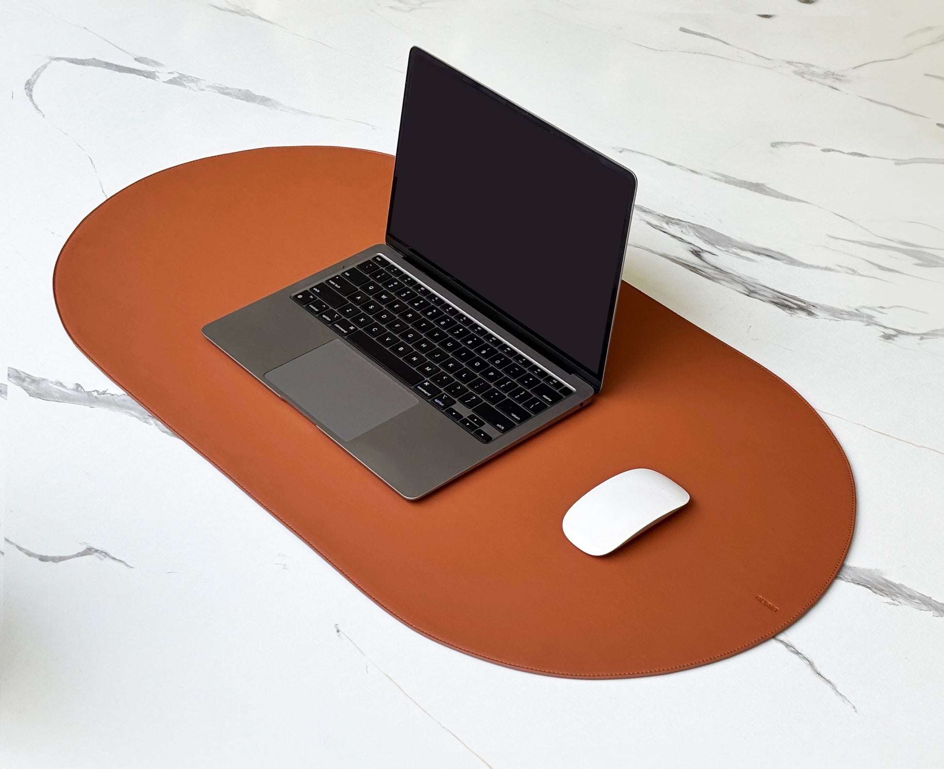 Elevate your workspace with this premium full-sized 32.75 x 17.5-inch capsule-shaped desk mat, crafted from ultra-soft, padded vegan leather. Reversible with warm tan on one side and calming blue on the other, it blends style with function. Water-resistant and finished with stitched edges for durability, its cushioned surface provides lasting comfort and support through long hours at your desk. Perfect for work or play, this mat adds a touch of elegance and ergonomic ease to any setup.