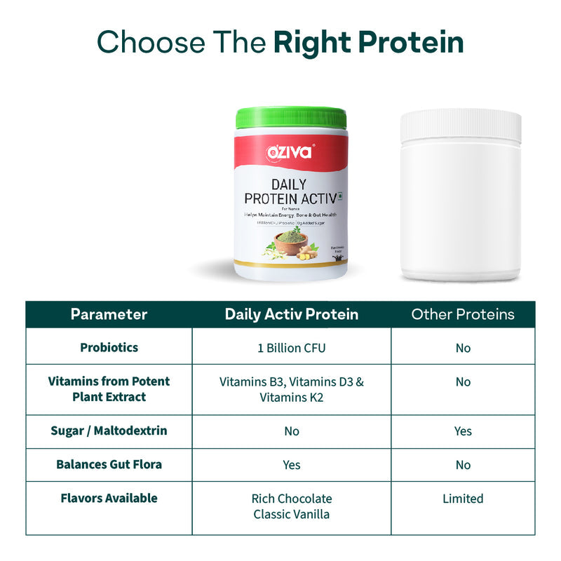 OZiva Daily Protein Activ for Women packs 33g of protein per 100g with essential Multivitamins, Minerals, and Probiotics for better energy levels, bone health, gut health and immunity. Available in 2 delicious flavours–chocolate and vanilla.