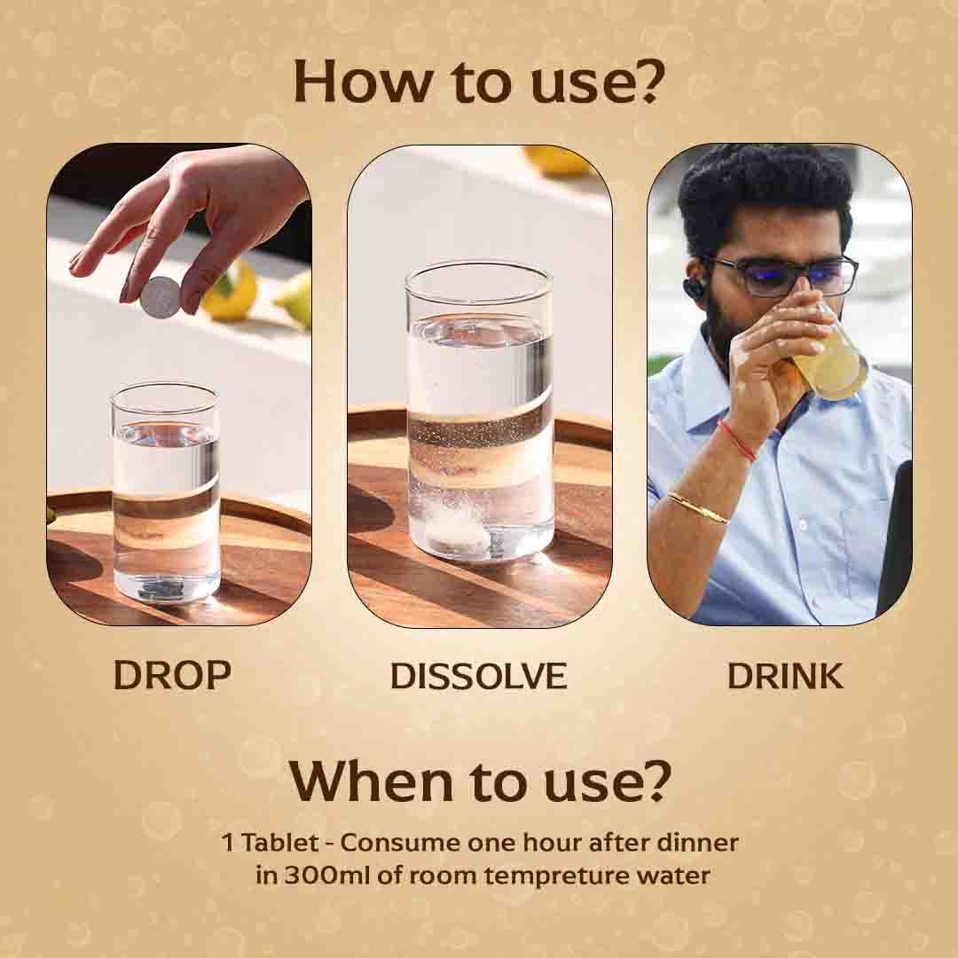 Give your body the ultimate herbal helping hand in the form of our Triphala effervescent tablets which promote healthy digestion, gently cleanse your system and nourish the entire body. Triphala takes the centre stage in this formulation courtesy its multi talented properties. It is considered a tri-doshic remedy, meaning that it is balancing to all constitutions and body types (vata, kapha, and pitta).